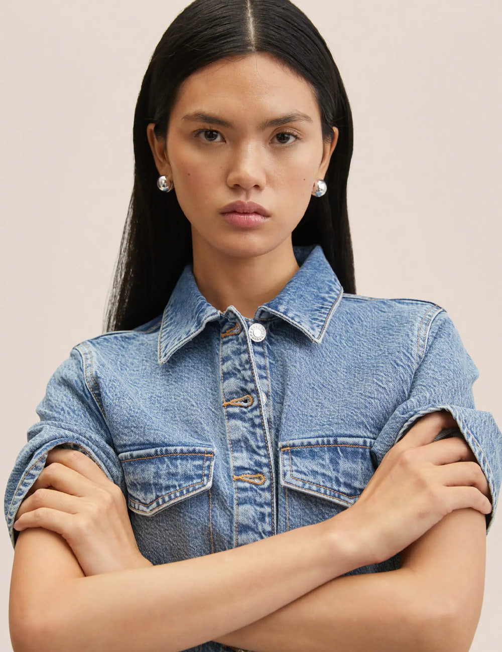 Regular fit shirt made of linen blend fabric. Stand-up collar and long sleeves with buttoned cuffs. Button-up front.