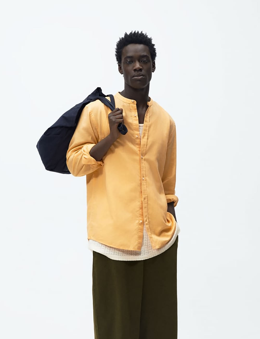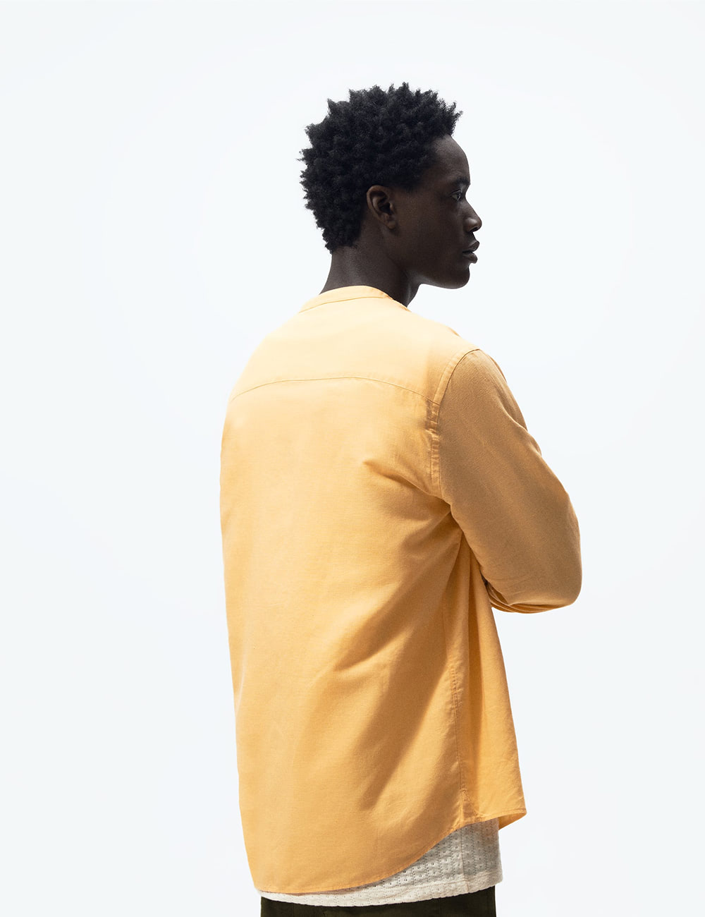 Cotton-blend fabric. Textured fabric. Long design. Evasé design. Wrap collar. Puffed short sleeve. Front slit. Knot detail. Bow closing on the back.