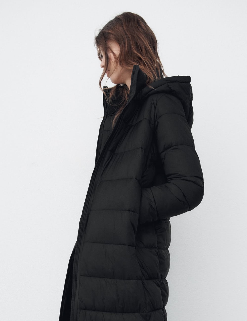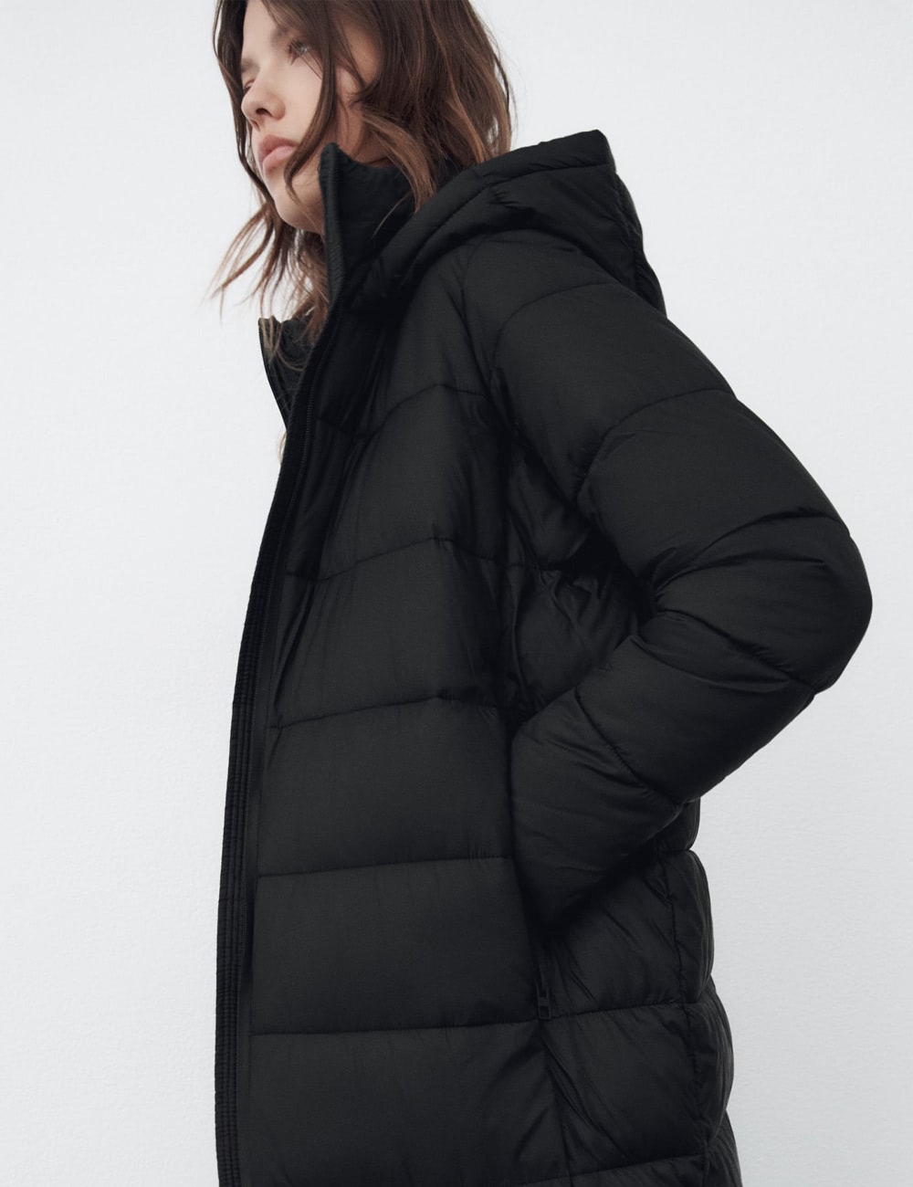 Cotton-blend fabric. Textured fabric. Long design. Evasé design. Wrap collar. Puffed short sleeve. Front slit. Knot detail. Bow closing on the back.